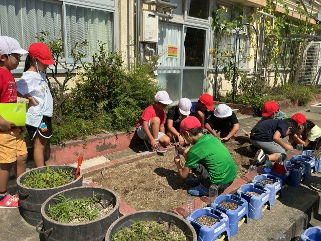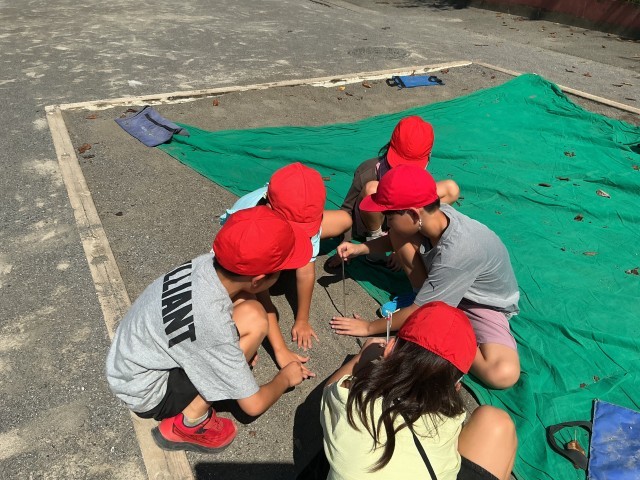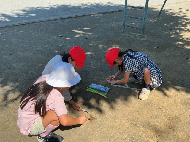 日なたと日かげの温度の違いを調べました。実際に温度を計って比べることで、太陽のあたたかさを実感している様子が見られました。場所によっては、45度以上のところもあったようでした。