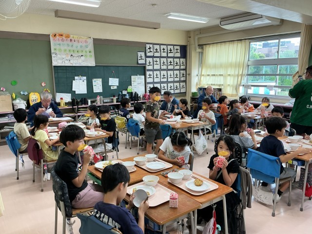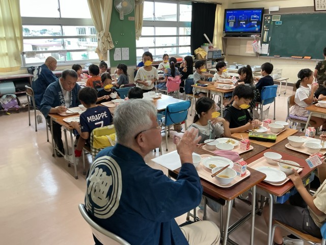 三土代会の皆さんからお餅つきに教えていただいた後は、ふれあい給食でした。お教室にお招きをして教室で一緒に給食を食べて、交流を更に深めました。