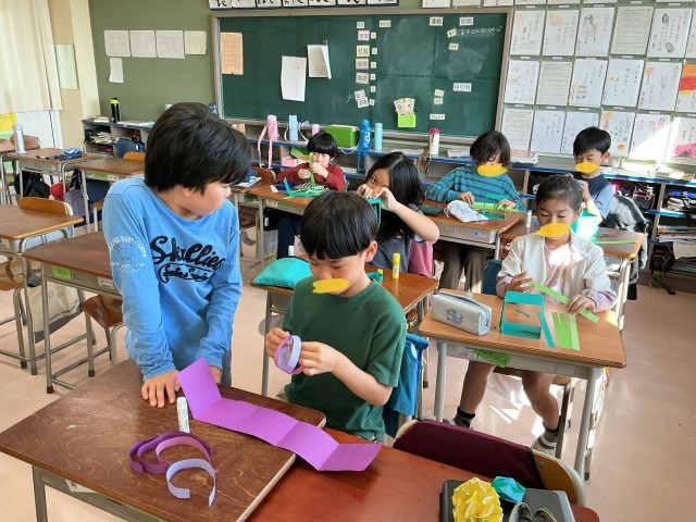 本日、縦割り造形集会を行いました。班ごとに協力して作品づくりに取り組み、異学年での交流を深めました。6年生は、図工の時間や休み時間を使って材料の準備をしたり、当日は下学年の児童にわかりやすく説明したりと、リーダーとして頼もしい姿を見せてくれました。下学年の児童も、上級生の優しい声かけに励まされながら、集中して楽しく活動していました。「楽しかった!」「もう終わり?」という声も多く、あっという間の時間でした。次回も楽しみです。