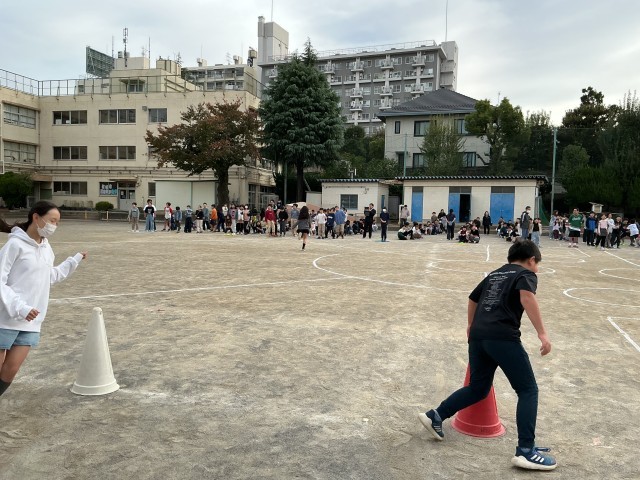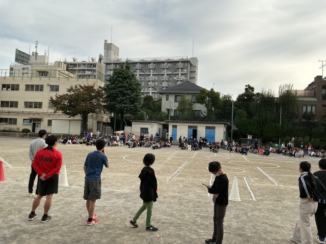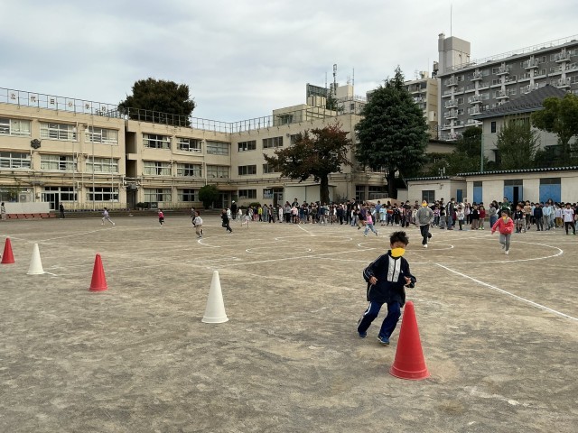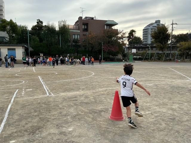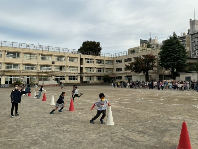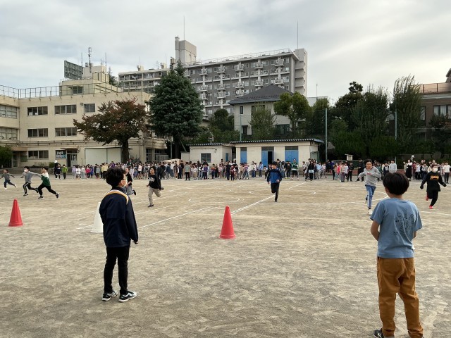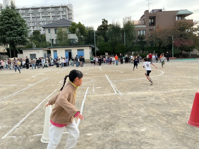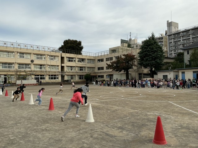 体育朝会は縦割り班対抗リレー。学年を越えてパスをつなぎ、笑顔あふれるリレーになりました!