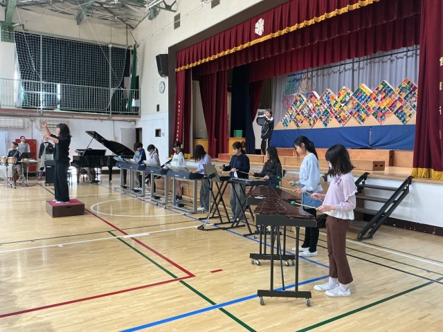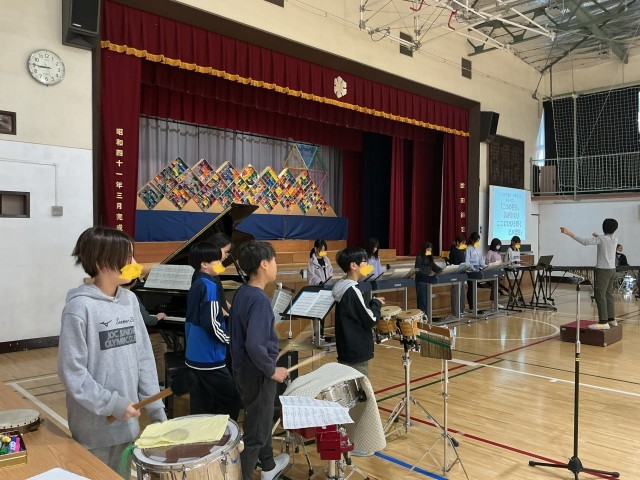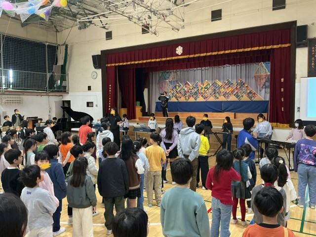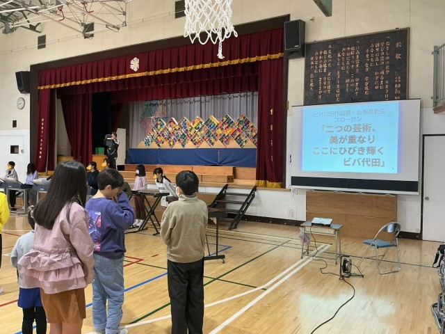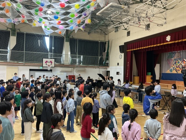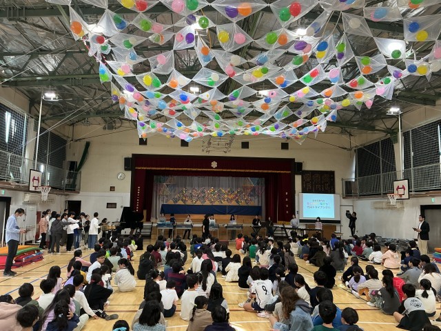 縦割り班活動で作った全校作品の完成披露と全校合唱を行いました。作品が披露されると体育館の中は子どもたちの驚きや感動の声が響き渡りました。そして音楽委員会の児童の演奏で全校合唱を行いました。今日の全校合唱は、土曜日、3階算数室前で上映予定です。