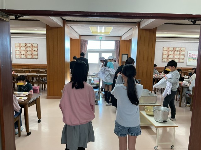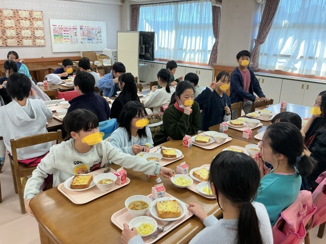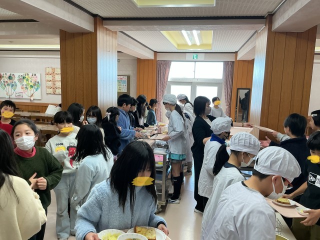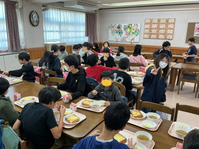 学年のみんなで一緒に食べる給食は、いつもとは少し違う特別な時間になりました。広いランチルームで友達と顔を合わせながら、ワクワクした気持ちで楽しく美味しく食べることができました。