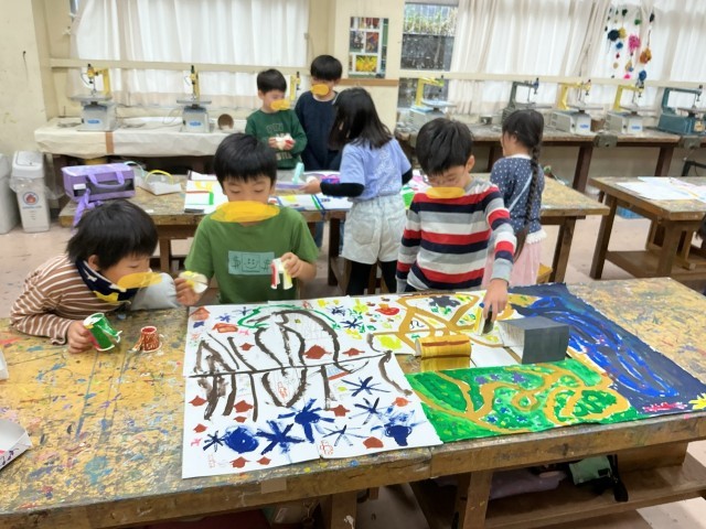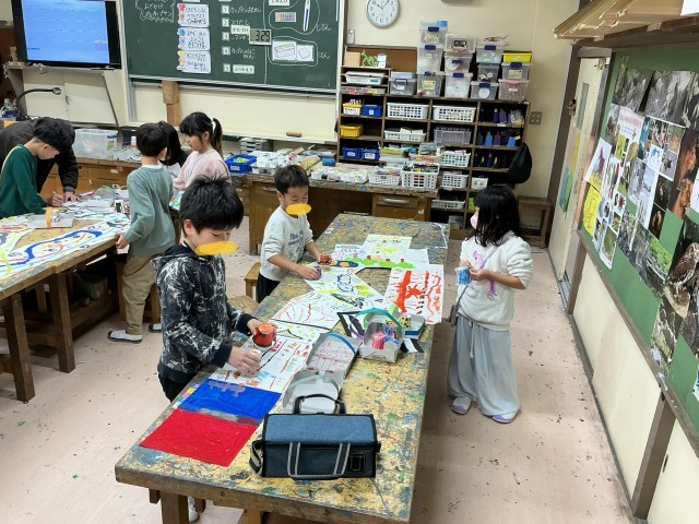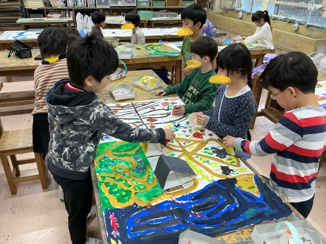 図工では、「友達と意見や考えを組み合わせながら作ろう」という めあて のもと、みんなで協力して“カップマンが通る道”を作りました。形やコースの工夫を話し合いながら、役割分担をして進める姿が見られました。また、絵の具の量や水の加減にも気をつけて色づくりに取り組み、鮮やかで個性あふれるグループ作品を仕上げました。