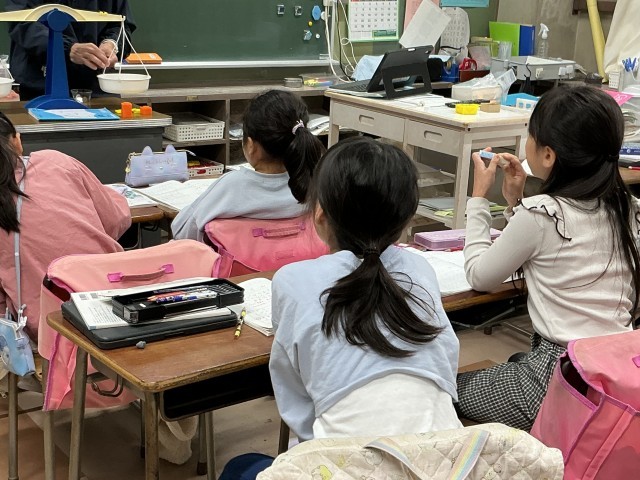 「重さの単位と測り方」の学習で、マグネットクリップと消しゴムではどちらが重いかを調べました。子どもたちはまず自分で予想を立て、「◯◯が何個分で確かめよう」とめあてをもって測定に取り組みました。結果が出る瞬間には、身を乗り出して天秤の動きを見守る姿が見られ、自分の予想と比べながら確かめることを楽しんでいました。活動全体を通して、課題を自分ごととしてとらえ、主体的に学ぼうとする姿がとても印象的でした。