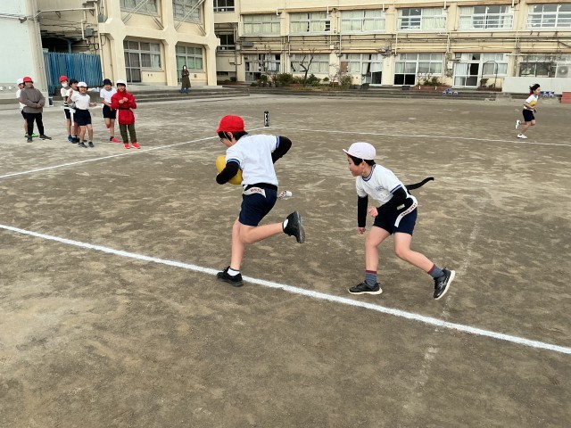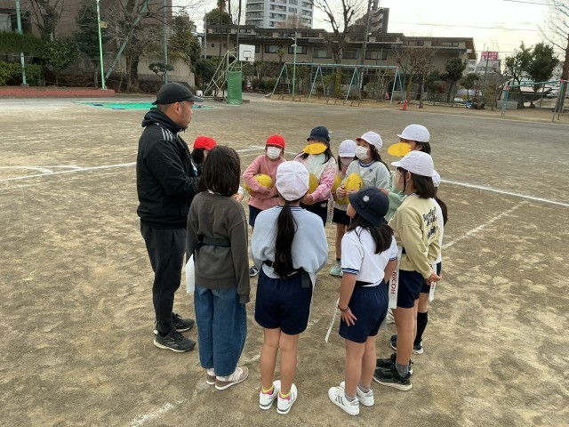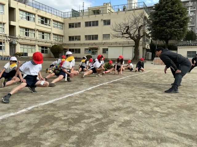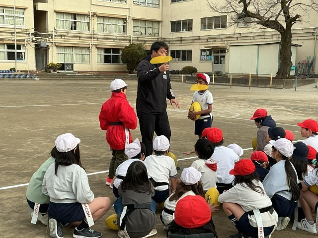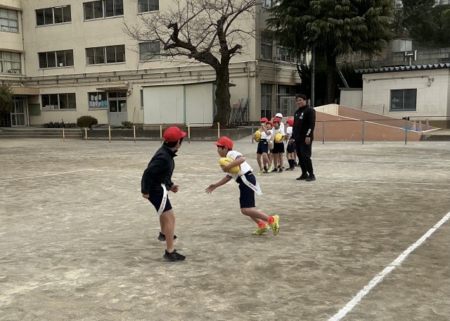 今年もリコーブラックラムズの皆様にお越しいただき、タグラグビーの出前授業を実施しました。パス練習から1対1の動きまで、笑顔いっぱいで取り組む姿が見られました。ラグビーの楽しさを体感できる貴重な時間となり、「試合を見に行きたい」という声も上がっていました。