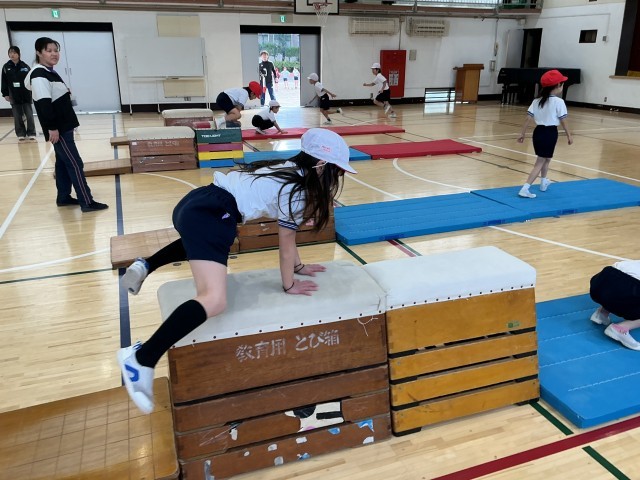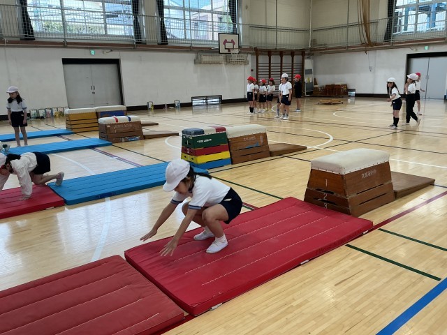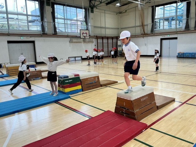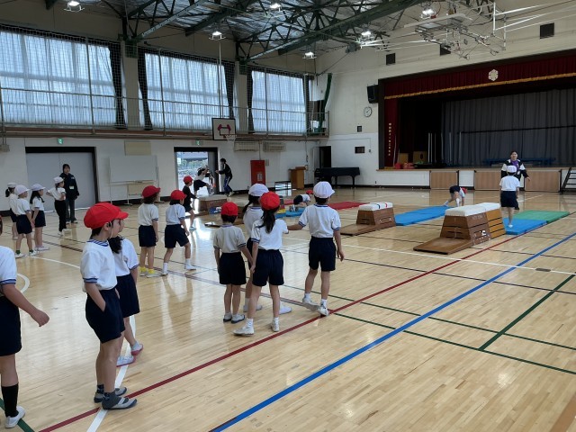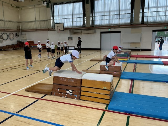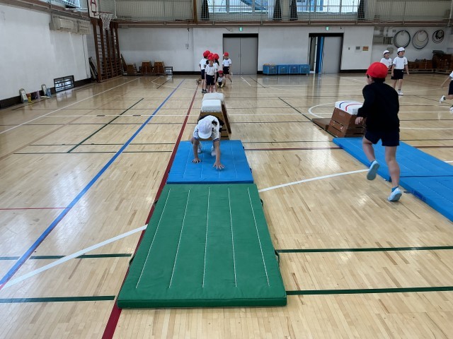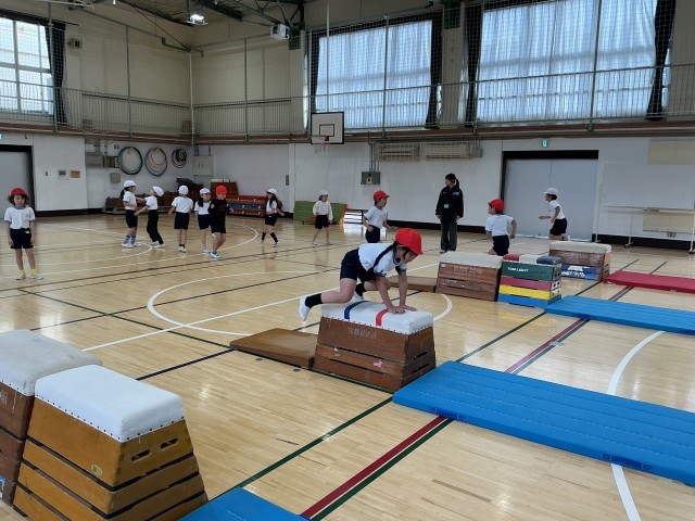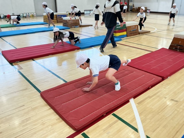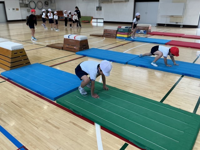 跳び箱では、跳び乗りや跳び降りに挑戦しました。タイミングよくジャンプをしたり、しっかりと両足で着地したりすることを意識しながら取り組むことができました。マット運動では、動物歩きや手をしっかりとついて体を丸め、前転がりなどの動きに挑戦しました。繰り返し取り組む中で、「できた!」という声がたくさん聞こえ、達成感を味わうことができました。