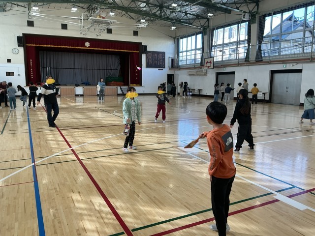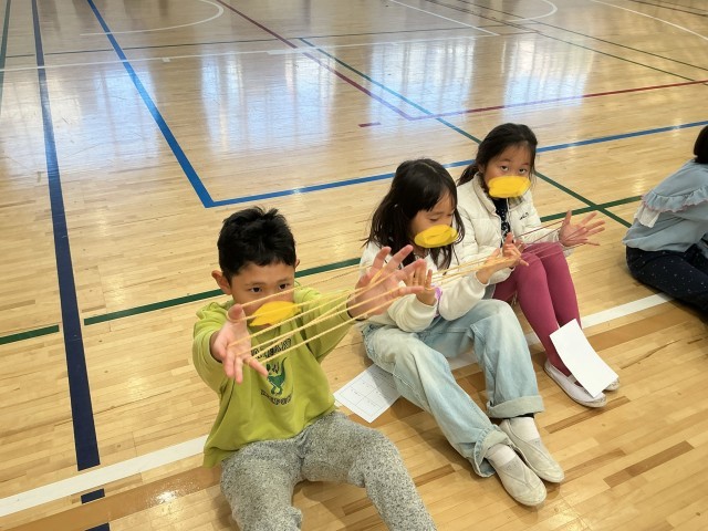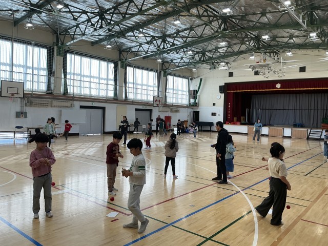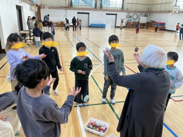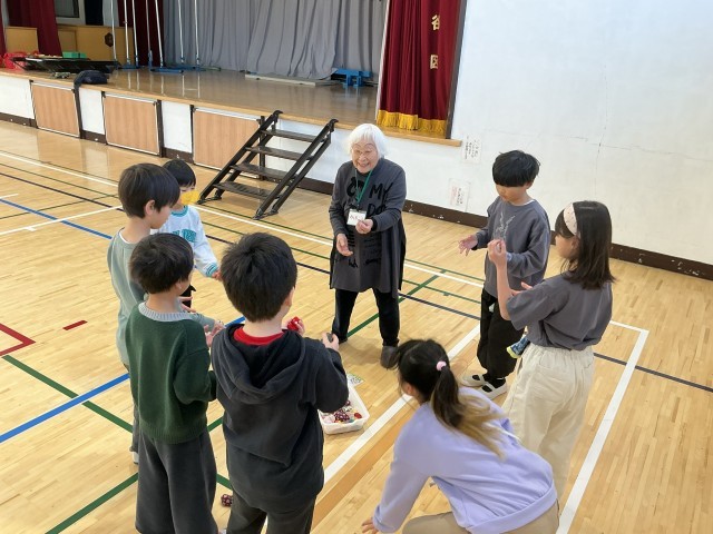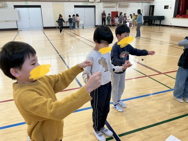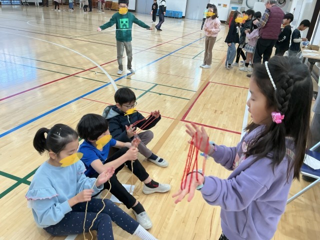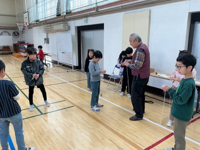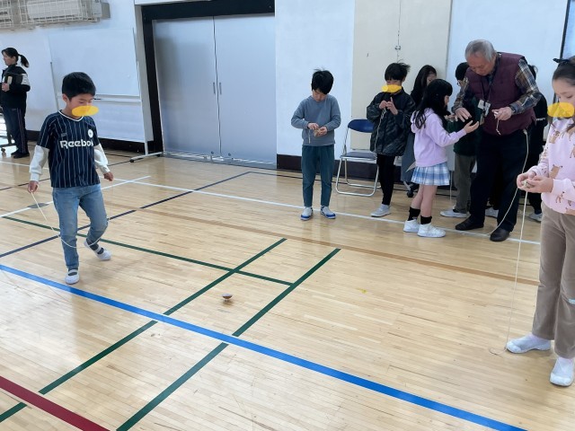 城南環境学習支援グループの皆様をお招きし、「昔遊び」を教えていただきました。子どもたちは、ボタン回しやけん玉、こま回し、羽つき、お手玉、あやとりなど、さまざまな昔ながらの遊びに挑戦しました。初めは難しそうにしていた子どもたちも、皆様に優しくコツを教えていただくうちに、だんだんと上達し、笑顔があふれていました。できるにつれて、子どもたち同士でも教え合う姿が増えていました。「できた!」「もう一回やりたい!」という声がたくさん聞こえ、楽しく充実した時間となりました。