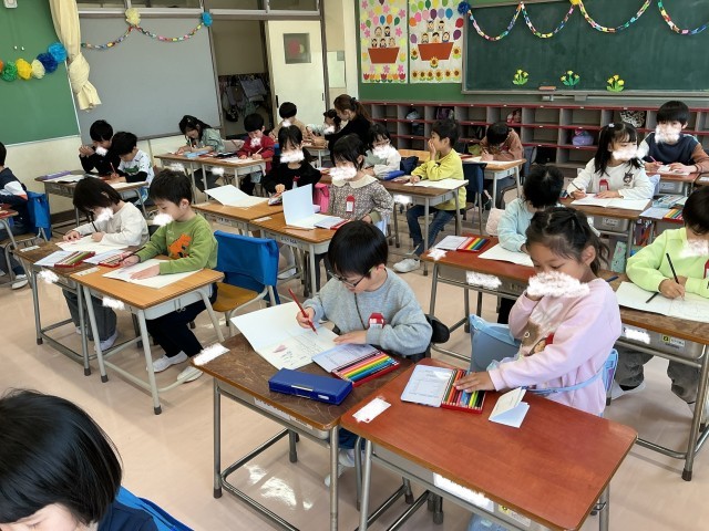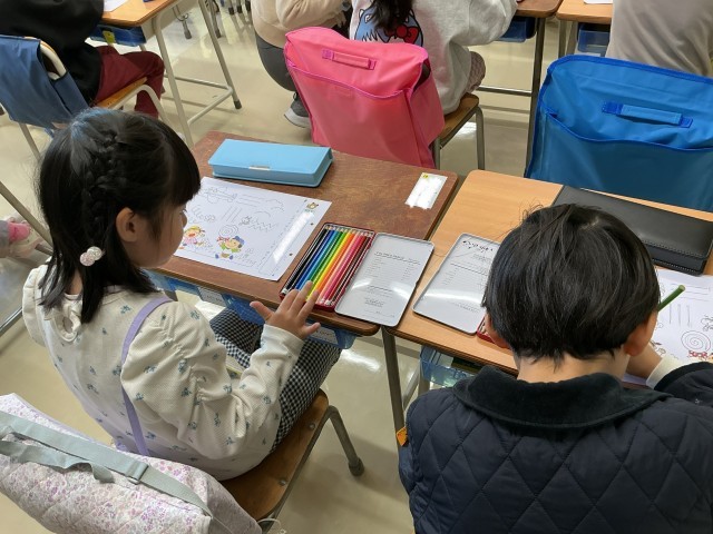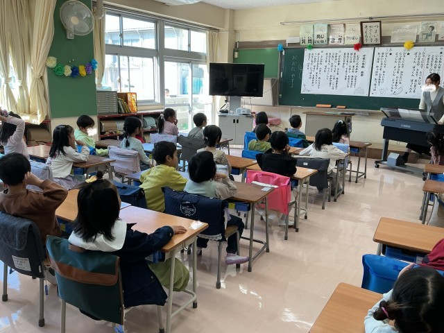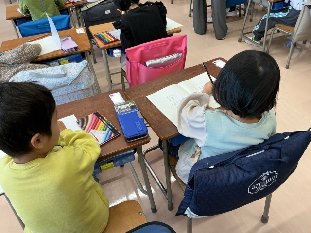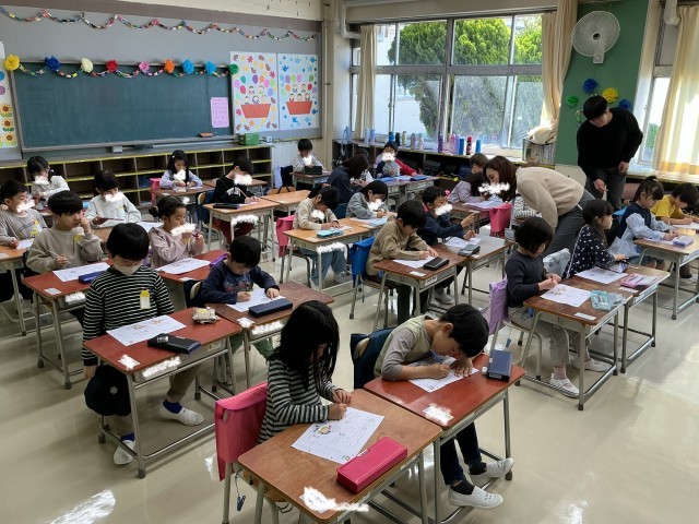 一年生の教室での活動が始まりました。意欲的に取り組んでいます。校歌の練習では、元気な声で歌えていました。また、線をなぞったり自由に絵を描いたりしながら、鉛筆の使い方も練習しました。丁寧に書こうとする姿が見られました。