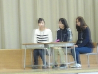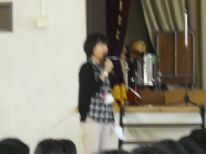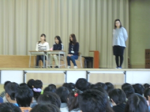 朝会で、本校の研究テーマでもある「話すこと・聞くこと」について、教職員が劇にして子どもたちに見せました。