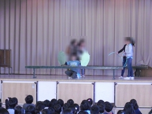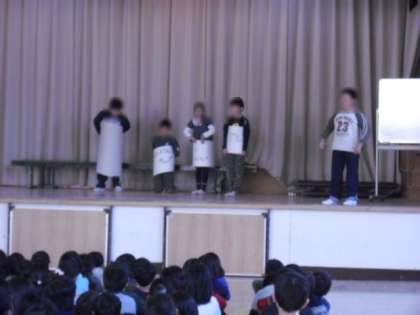 今月の委員会集会は、エコ・栽培委員会でした。わかりやすく、ユーモアたっぷりな劇で、学校で行っているリサイクル活動について紹介しました。