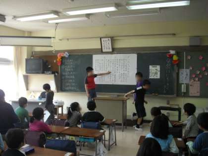 音楽委員会の5,6年児童は、1年生に代田小校歌を覚えてもらおうと、出張サービス。