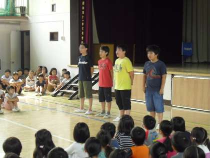 子供たちは全員で歌う前に、6年生代表児童による二部合唱を聴きました。