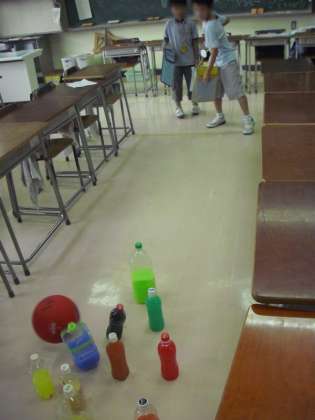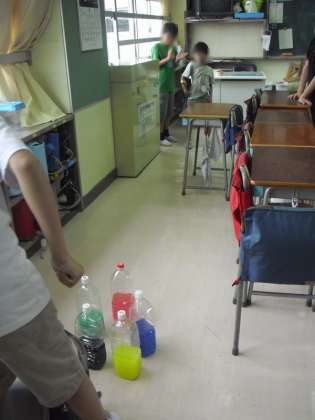 5年1組は、校庭で「代田くんをさがせ」、教室で「ボーリング」という2つのお店を出しました。ボーリングのピンがたおれると、お客さん以上に喜び、盛り上げてくれる店員さんでした。