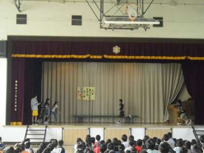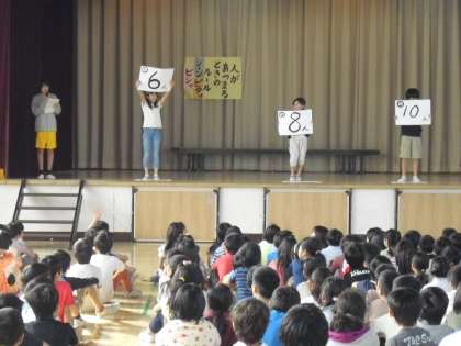 児童集会で、委員の子どもたちが楽しいゲームをしてくれました。舞台に出てくる人数、ボールを持っている人数、メガネをかけている人の人数が何人かを答える問題でした。1年から6年まで興味をもって取り組んでいました。
