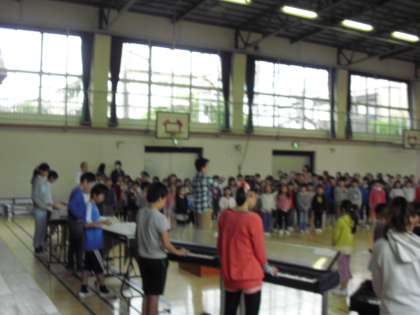 今日の音楽朝会では、ビバ代田で全校合唱で歌う歌の練習をしました。伴奏の5,6年代表にのり、楽しく歌うことができました。