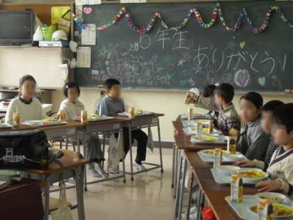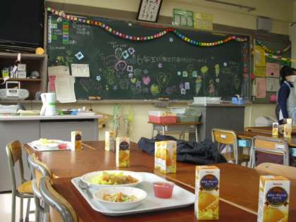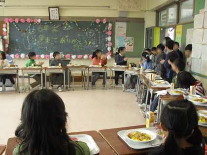 5年生を中心に各教室を飾り付け、給食を配膳し一緒に給食いただきました。