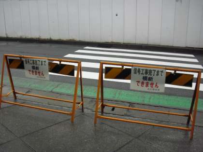 押しボタン式信号機の設置に加え、本日、東門前に横断歩道がペイントされました。しかし、「横断できません」と警察の表示がついています。