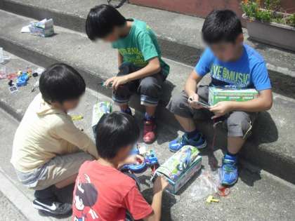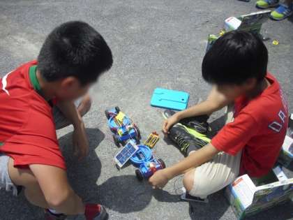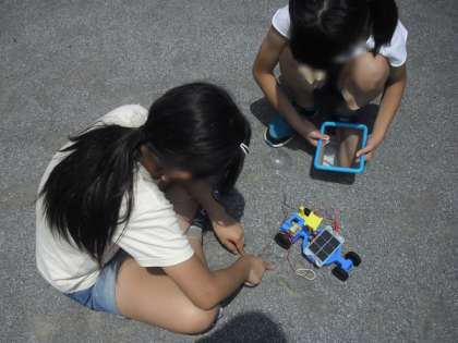 お天気に恵まれず、ずっとできなかった光電池を使った実験が、今日やっとできました。太陽の光だけでモーターが動き出し、大喜びでした。