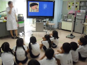 計測の時に、保健室で養護の先生から傷の手当ての仕方とAEDについてのお話をいただきました。傷口をきれいに洗うこと、鼻血が出たら下を向いて鼻をおさえることなど、早速実行している子もいました。