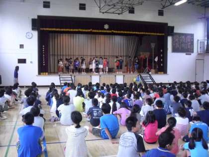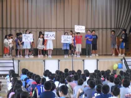 さて、今日の児童集会は、土曜日に行われる、代田っ子まつりの紹介集会を行いました。各クラスの代表者が、工夫したお店をアイディアあふれる内容で、紹介してくれました。
