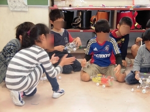 生活科の「つくってあそぼう」という単元で1年生と一緒に遊ぶためのおもちゃを作りました。ペットボトルの車、あきかんをつかったアーチェリーなどいろいろな種類のおもちゃを作り、どうすれば1年生が楽しんでくれるか一生懸命考えていました。
