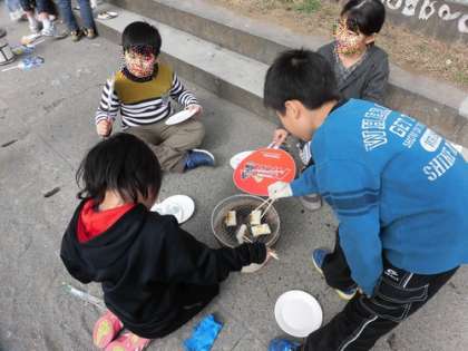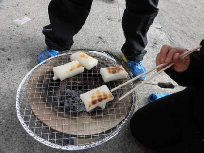炭に火が着き、お餅が焼けると、今までの努力が報われたように、満面の笑顔で焼けたことを知らせてくれました。砂糖醤油にのり、きな粉をお好みでまぶして、みんなで「美味しいね」と言い合いながら食べていました。