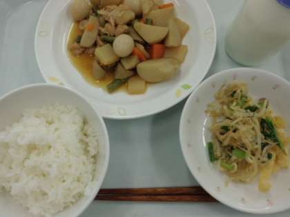 ごはん、牛乳、鶏肉と里芋のうま煮、カリカリ油揚げと野菜のおひたし