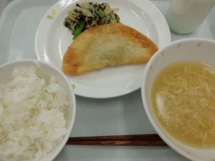 ごはん、ジャンボぎょうざ、野菜ののり和え、サンラータンスープ、牛乳