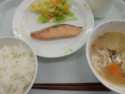 ごはん、甘塩鮭焼き、即席漬、冬野菜のみそ汁、牛乳