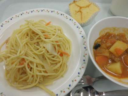 ★今日はヨーグルトを使ったケーキでした。食感はもちもちしていて、ヨーグルトと桃の風味もほんのり感じます。野菜のトマト煮は、鶏肉やじゃがいもも入っていたので、食べやすかったようです。