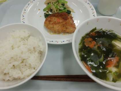 桜ごはん、和風ハンバーグ、ごまあえ、すまし汁、牛乳