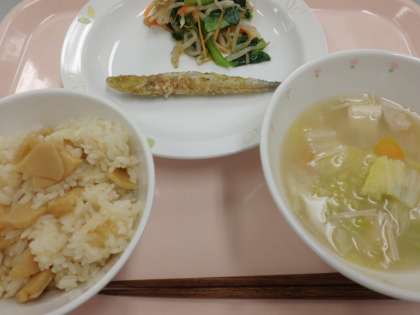 たけのこごはん、ししゃものカレー揚げ、おひたし、豆腐汁、牛乳