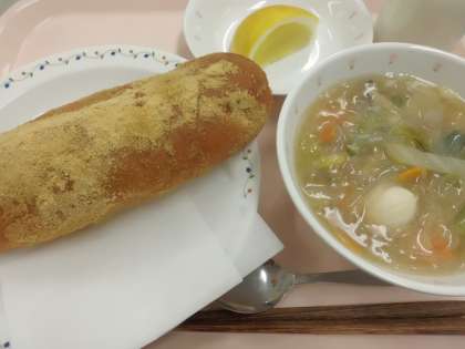 きな粉あげパン、肉団子入り春雨スープ、くだもの、牛乳