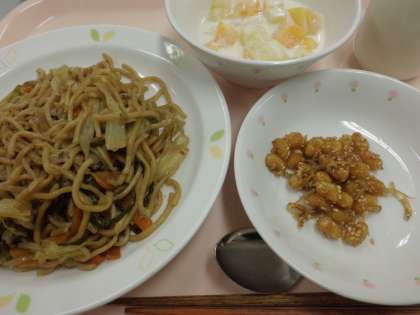 ソース焼きそば、大豆とじゃこの甘辛あげ、フルーツヨーグルト、牛乳