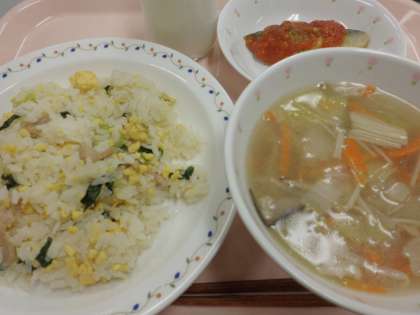 青菜のチャーハン、さばのチリソースがけ、中華スープ、牛乳