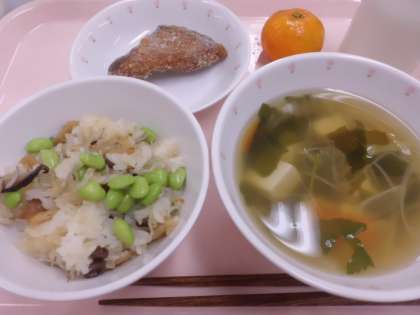 まめまめおこわ、かつおの立田あげ、すまし汁、くだもの、牛乳