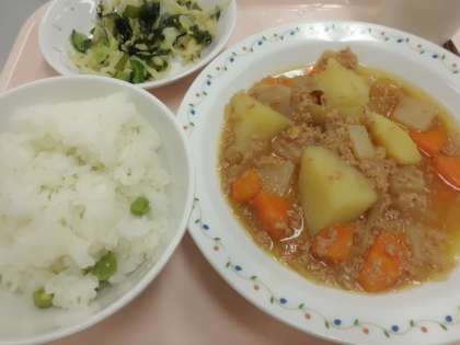 グリンピースごはん、新じゃがいものそぼろ煮、わかめサラダ、牛乳