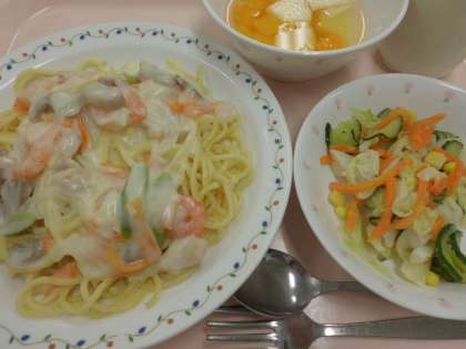 スパゲッティクリームソース、フレンチサラダ、フルーツポンチ、牛乳
