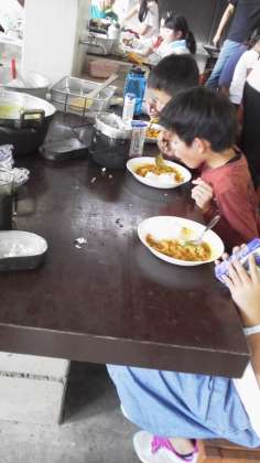 手作りカレーライスは、とても美味しいそうです。みんなパクパク食べています。