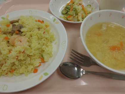 パエリア、フレンチサラダ、チーズのふわふわスープ、牛乳