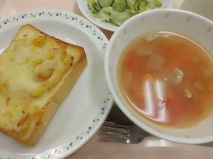ツナコーントースト、ミネストローネ、グリーンサラダ、牛乳
