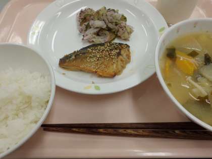 ごはん、さばの七味焼き、野菜のゆかりあえ、具だくさんみそ汁、牛乳