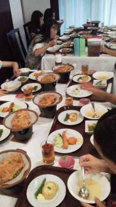 入浴も終わり、ハイキング疲れも取れて、みんな元気復活。カツ煮が人気です。