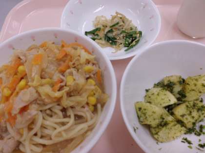 みそつけめん、もやしのごま風味、青のりポテト、牛乳