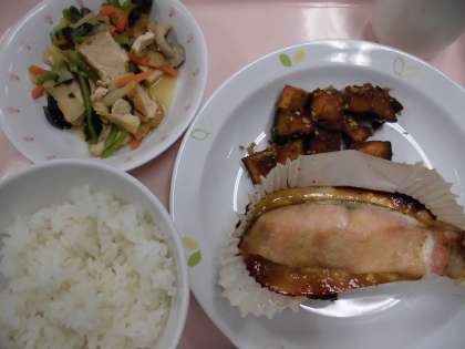 ごはん、鮭のみそマヨネーズ焼き、かぼちゃのごまだれかけ、煮びたし、牛乳