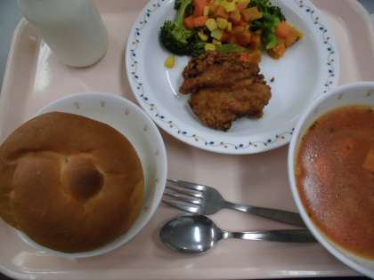 ミルクパン、鶏肉のからあげ、カラフルサラダ、トマトスープ、牛乳