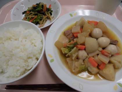 ごはん、豚肉と大根のうま煮、野菜のごまだれかけ、牛乳