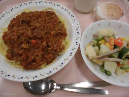 ミートソーススパゲッティ、ポテトサラダ、ブランマンジェ、牛乳