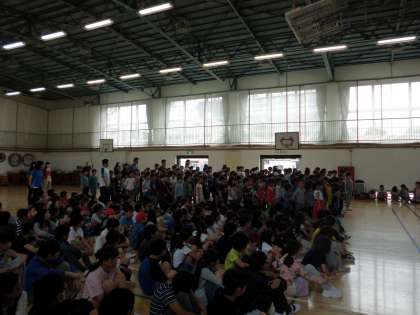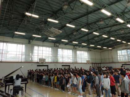 5月15日(水)に音楽朝会を行いました。運動会で歌う「ゴーゴーゴー」を練習しました。赤組、白組に分かれて元気な歌声が体育館に響きました。運動会本番に向けて、さらに練習をしていきます。