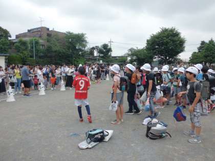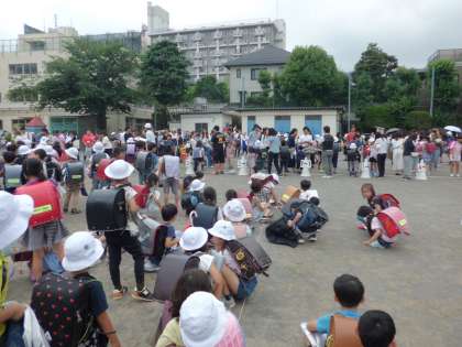 4時間目に引き渡し訓練を行いました。直下型地震の警戒宣言発令を想定し、今年度は校庭で引き渡しを行いました。